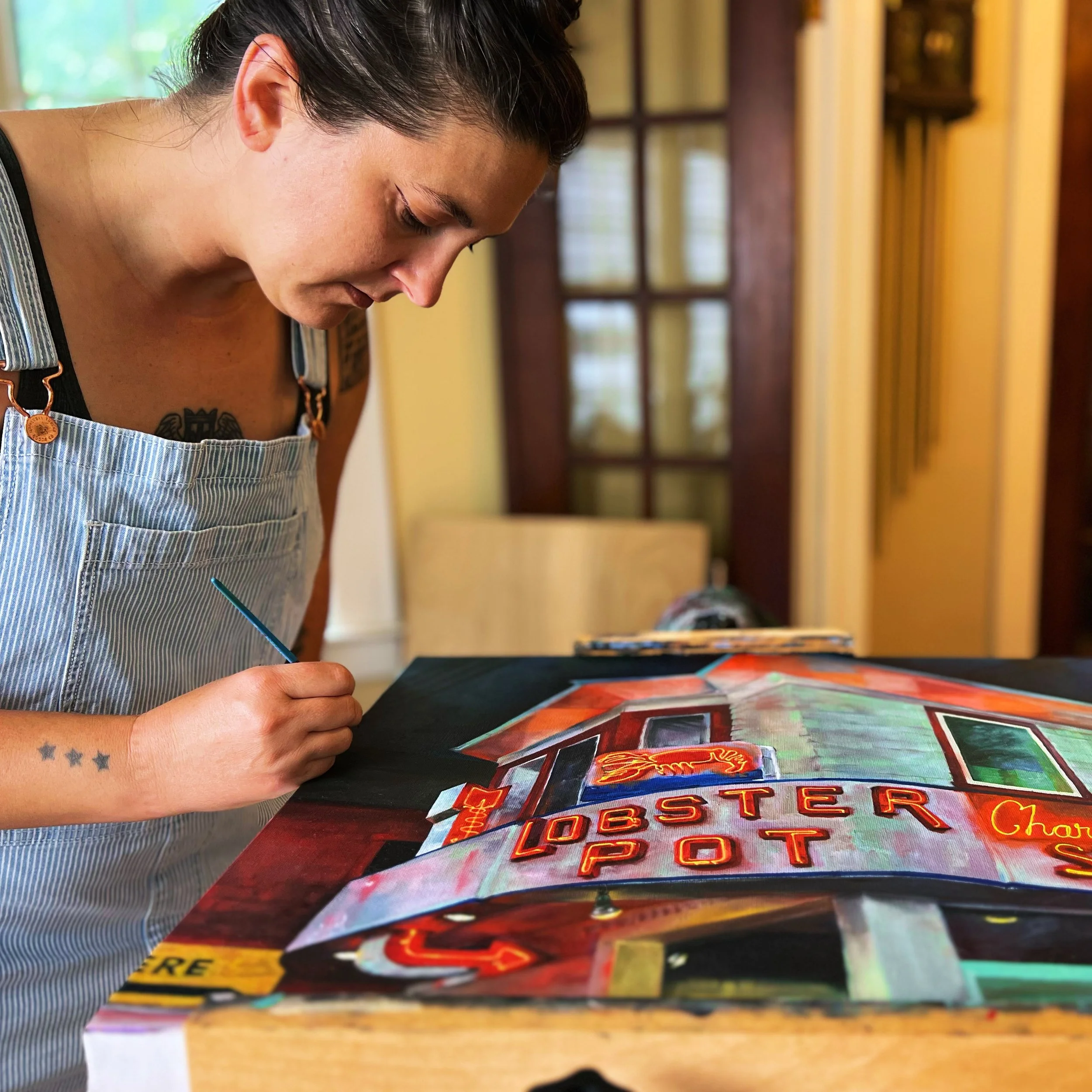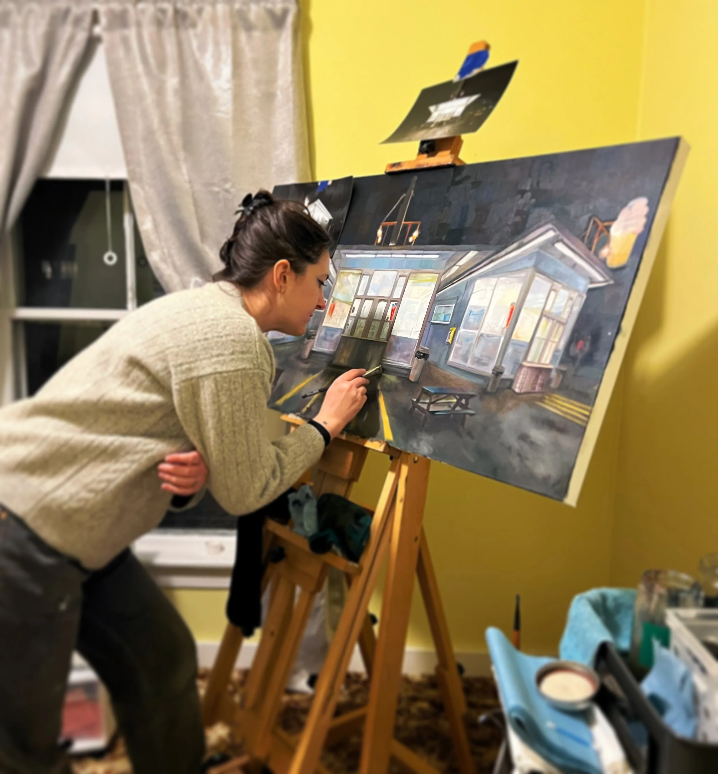 My paintings mainly focus on scenes that honor the special luminosity and intrigue created as night falls. With these paintings, I construct places caught between the familiar and separate. In the shifting darkness, shapes and structures warp and expand, shadows lengthen, light takes on an ethereal quality, and the everyday moves into the almost-magical. My work is heavily influenced by cityscapes and architecture, with each painting serving as a reflection of place and time in relation to a memory. This process is a way for me to re-experience these memories and emotions evoked by this retrospective practice in color, tone, and temperature. Oil paint lends itself being incredibly nuanced; able to capture the deep darks to bright lights, and all that glows in between.